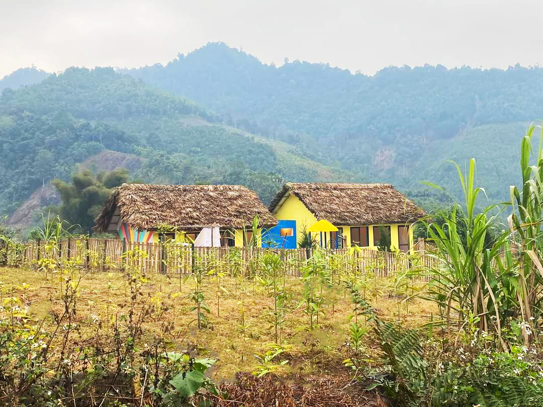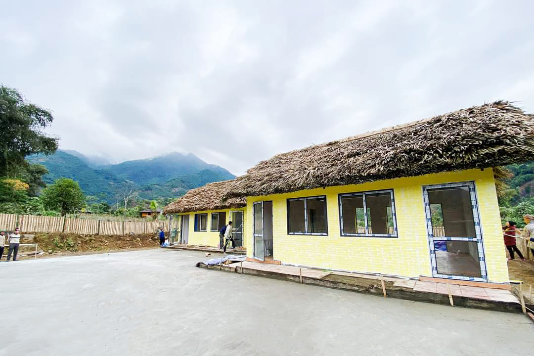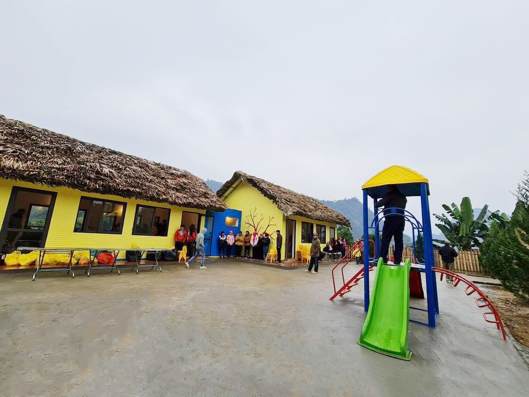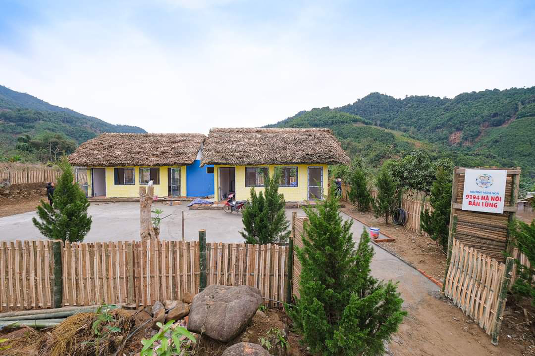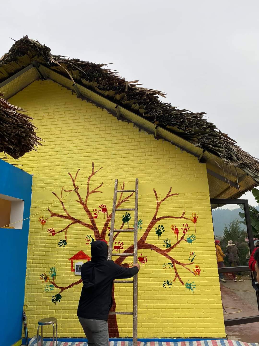 Tường gạch thẻ được sơn màu từ nhà tài trợ. Màu sắc chủ đạo vàng, trắng, xanh dương. Các mảng tường được vẽ đơn giản. Phần mái được thiết kế sử dụng tôn xốp chống nóng và mặt ngoài được phủ thêm lớp cọ để giảm nóng vào mùa hè và đồng thời tạo cảm giác hài hòa với cảnh quan thiên nhiên.